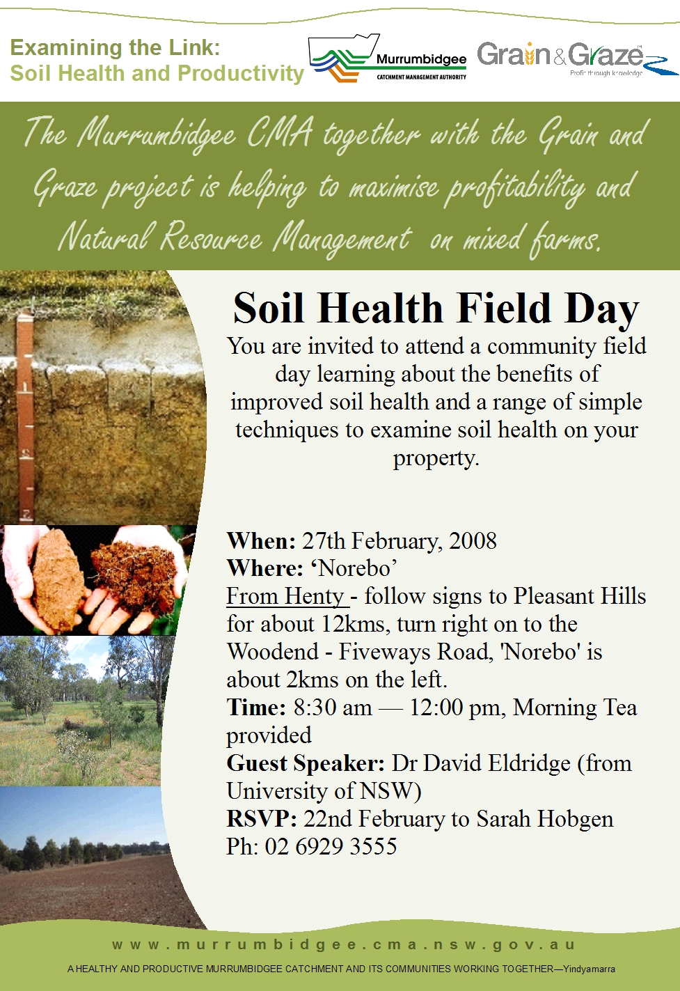 You are invited to attend a community field day learning about the benefits of improved soil health and a range of simple techniques to examine soil health on your property.