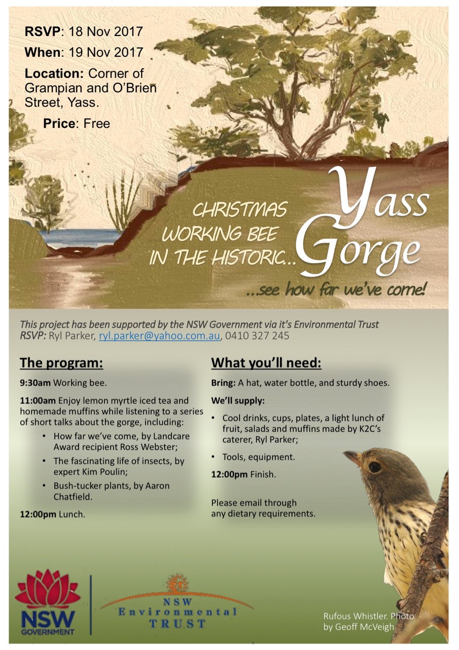 Come along to a working bee at the Yass Gorge (9.30 to 11.00 am), followed by lemon myrtle iced tea and homemade muffins! While you are enjoying the morning tea, you'll also be able to listen to a series of short talks about the gorge, including: